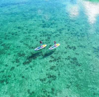 SUP(スタンドアップパドルボード)では、海上を滑るように進むあなたの姿と、その下の透明な海を泳ぐ熱帯魚の群れを、空から一枚の絵のように切り取ることが可能です。